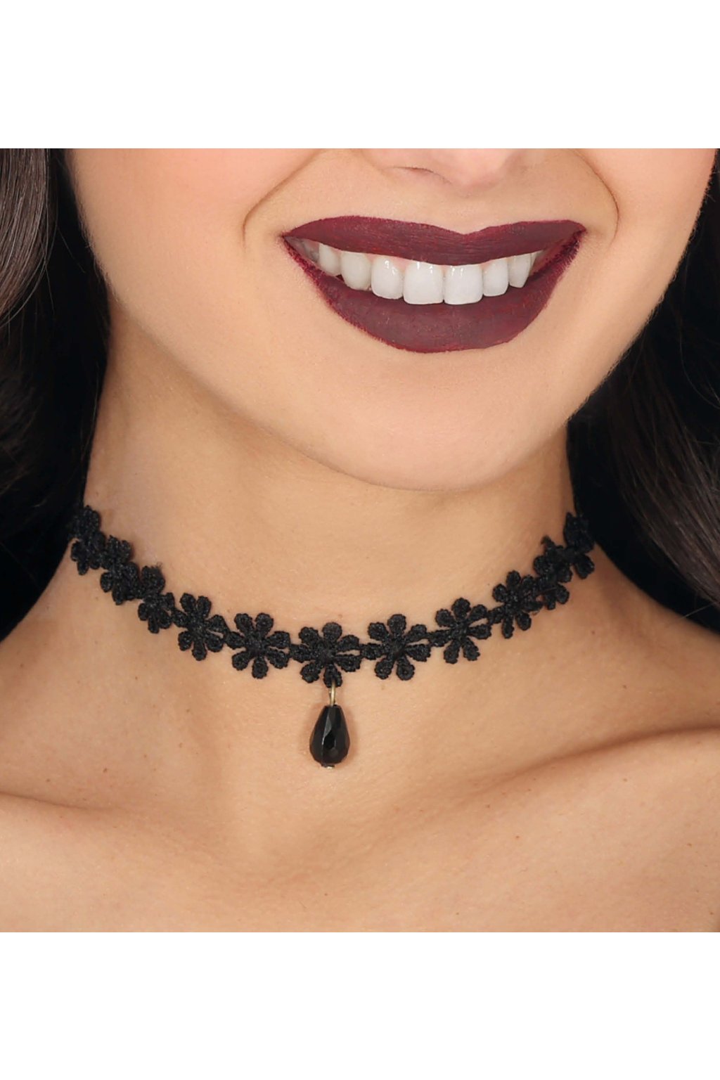 Krajkový choker z jemných květinových prvků s lesklým černým přívěskem