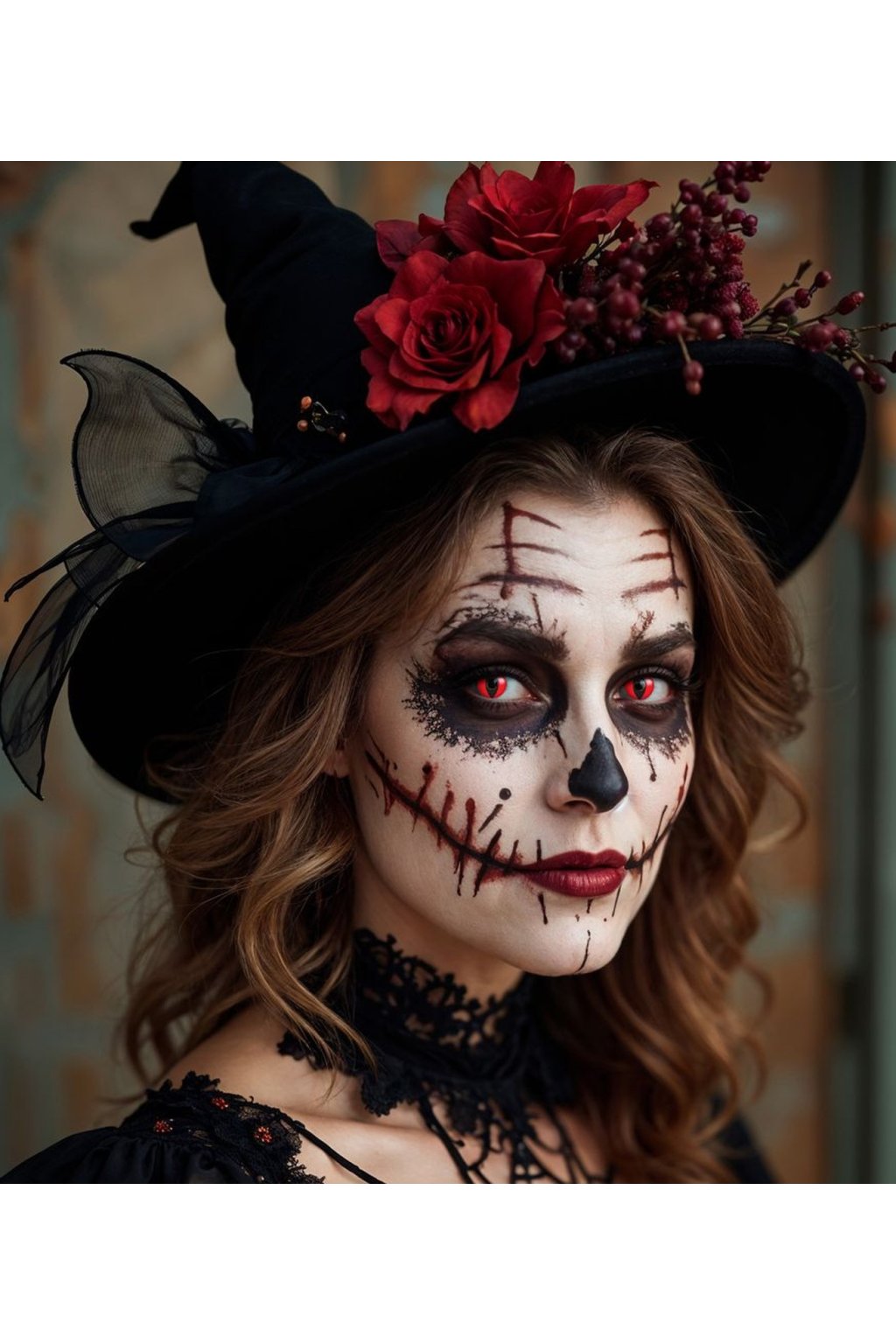 Tyto červené kontaktní čočky mají zářivou barvu a zornička je černou barvou protažena do úzké škvírky, díky tomu je docílen efekt "kočičích očí".