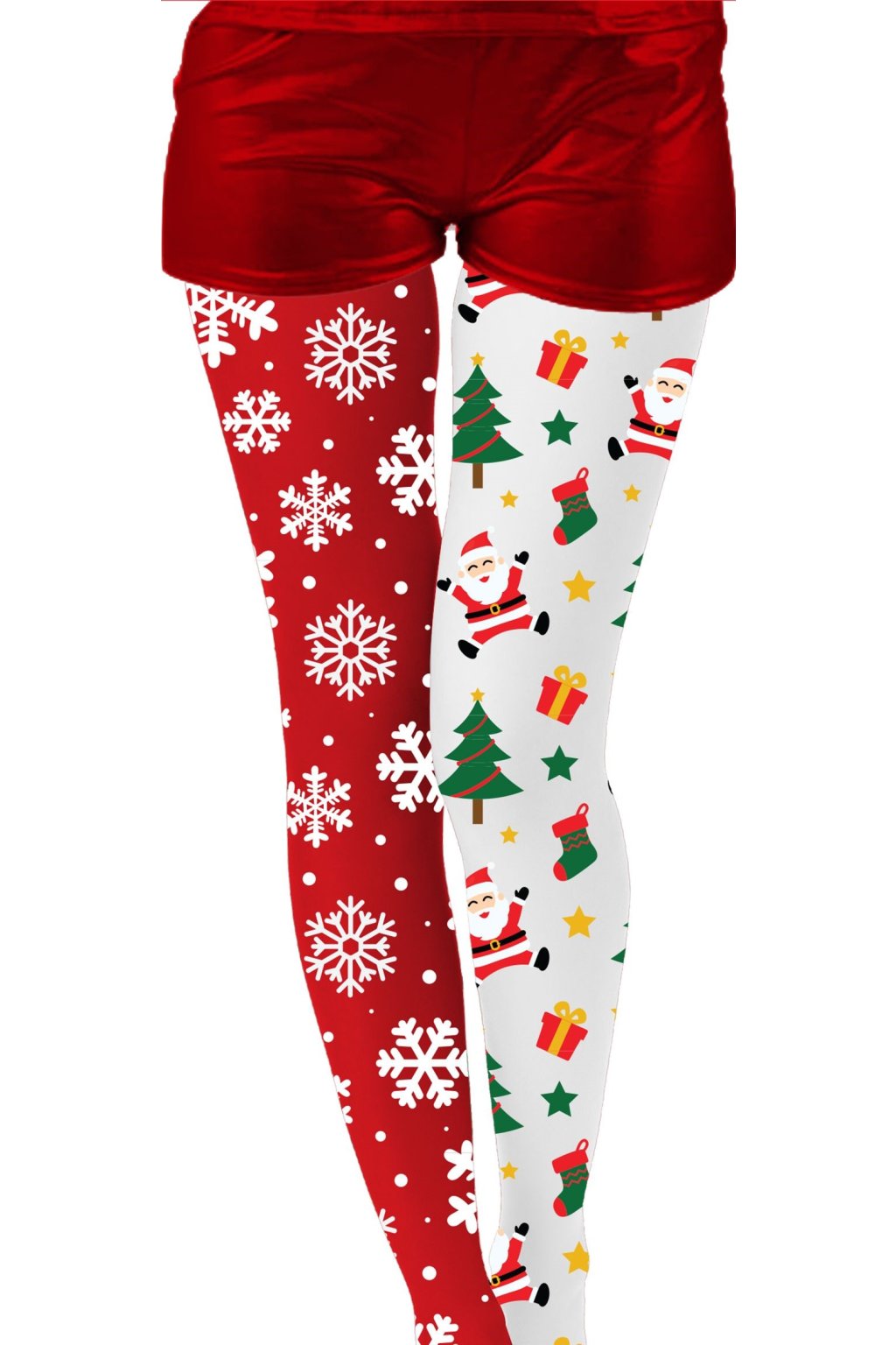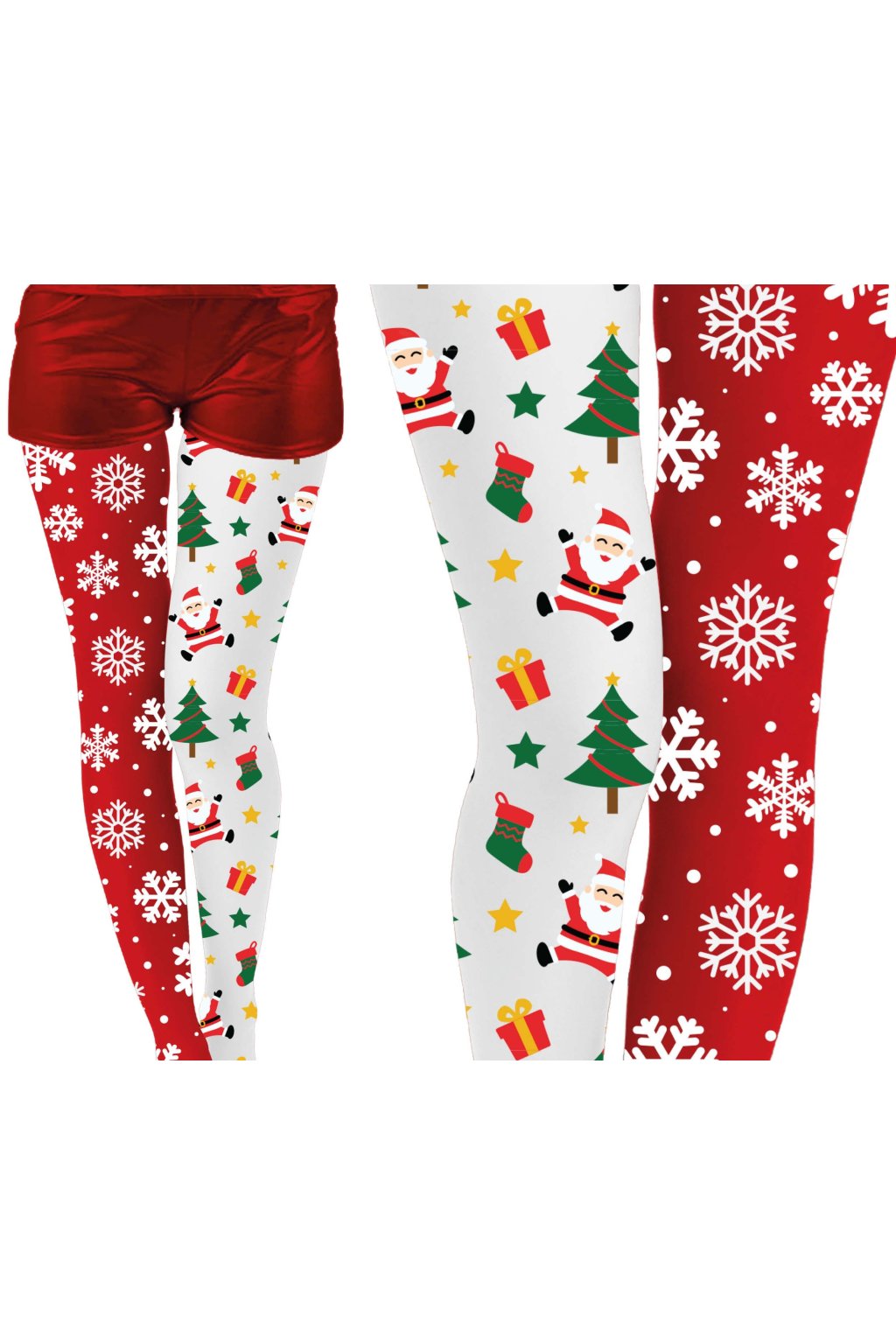 jedna nohavice se sněhovými vločkami, druhá s vánočními motivy