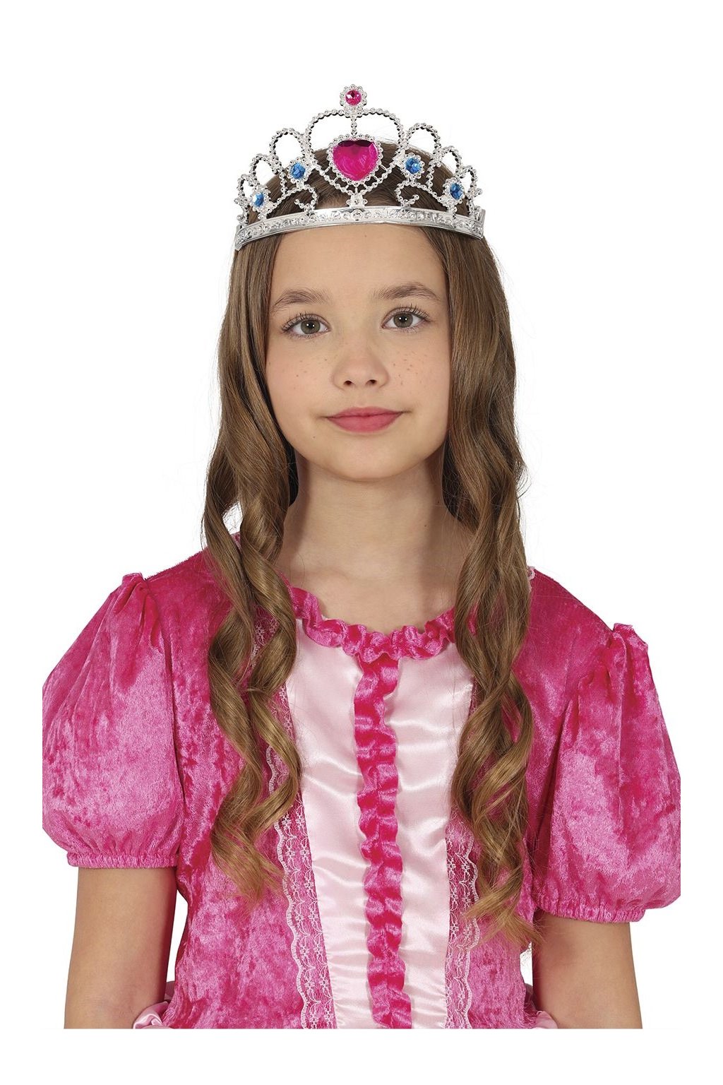 stříbrná korunka zdobená růžovým srdcem a modrými kamínky