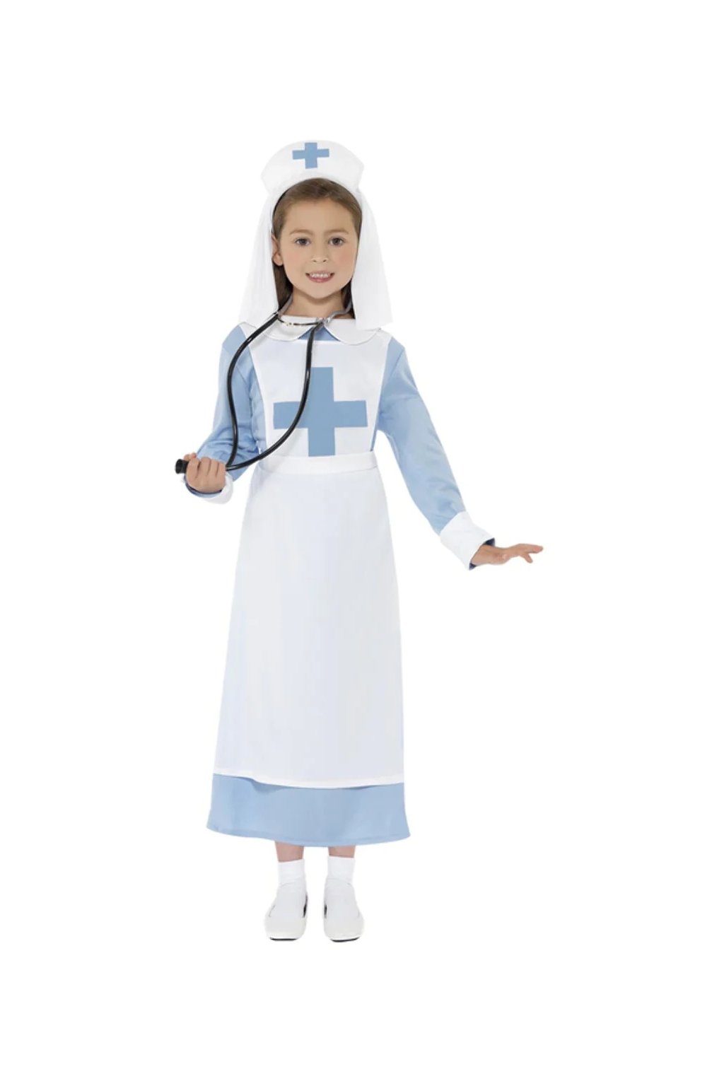 Klasický styl sestřičky s bílou zástěrou a modrými detaily