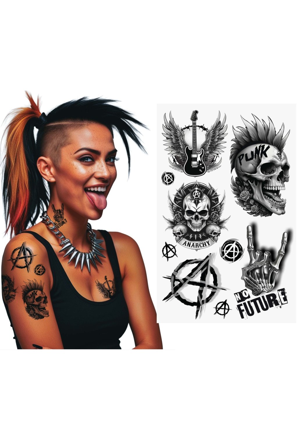 výrazné motivy lebek, anarchie, kytar a punk nápisů arch 30x14cm