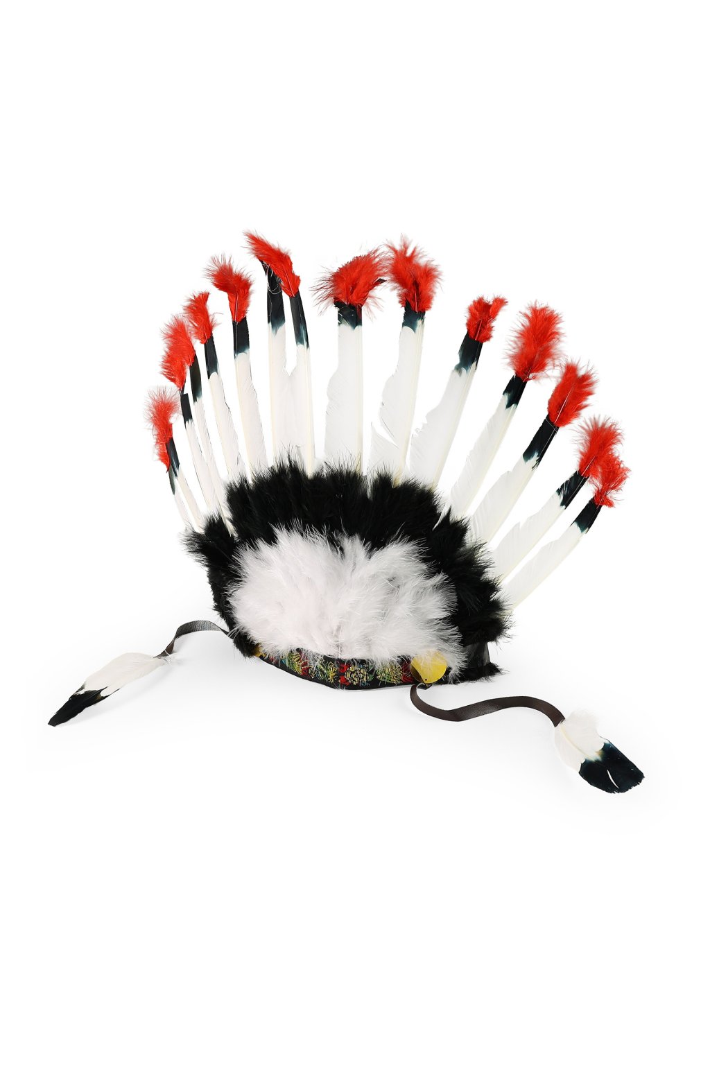 bohatá koruna z dlouhých bílých per s červenými konci