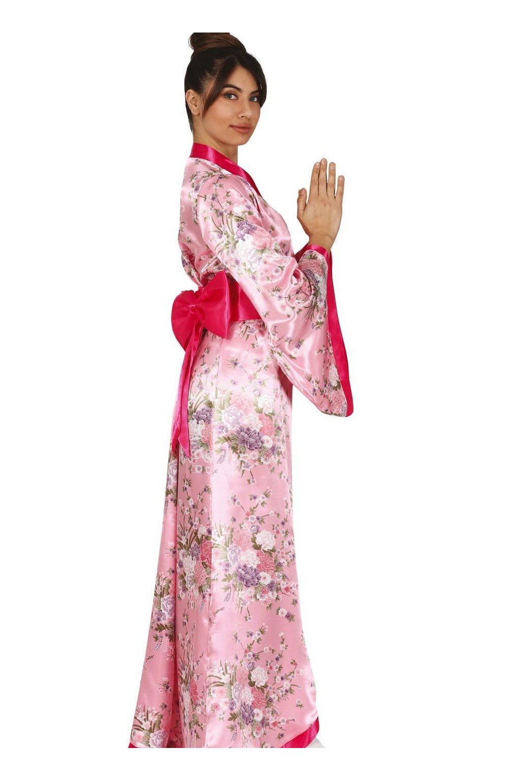 Dlouhé saténové kimono s květinovým potiskem inspirovaným japonskou kulturou