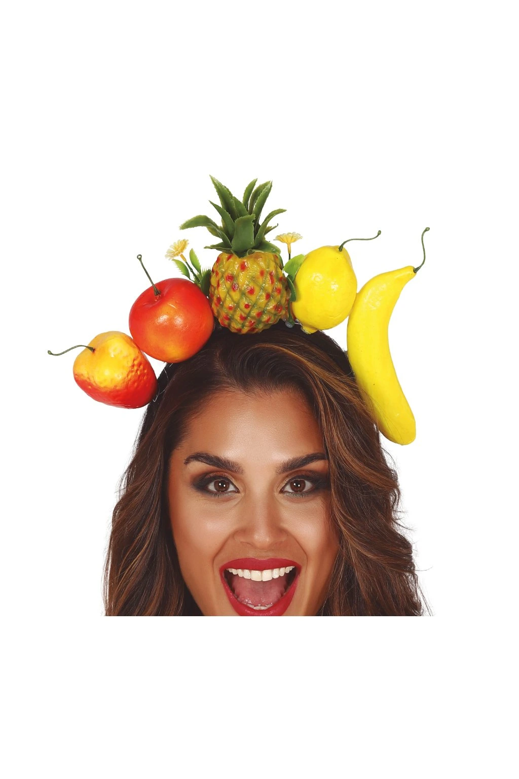 - výrazná čelenka s realistickým ovocem (ananas, banán, jablko, citron)