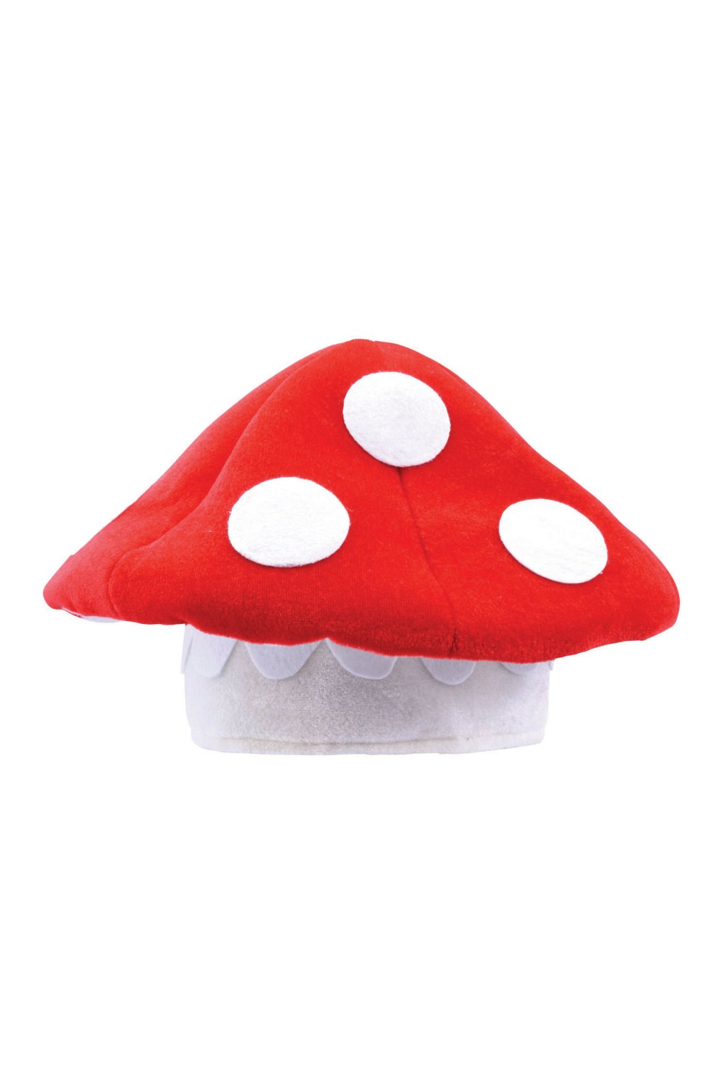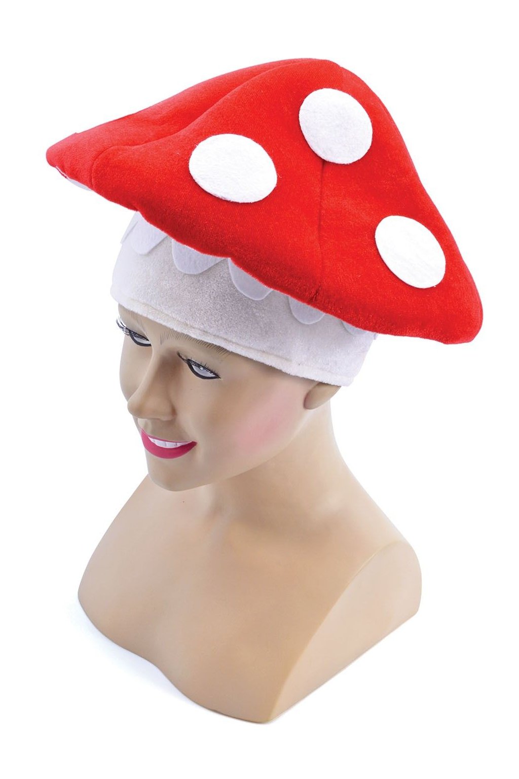 - Zábavný klobouk ve tvaru muchomůrky s červeným vrškem a bílými puntíky.