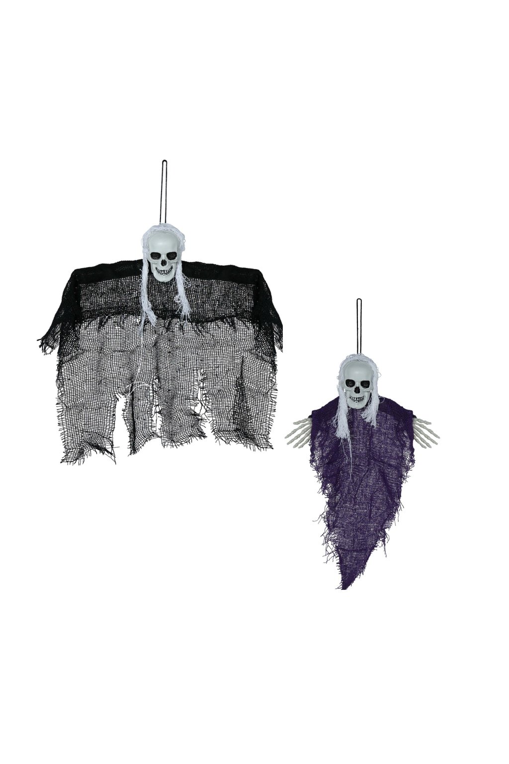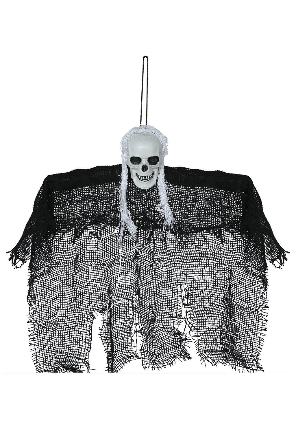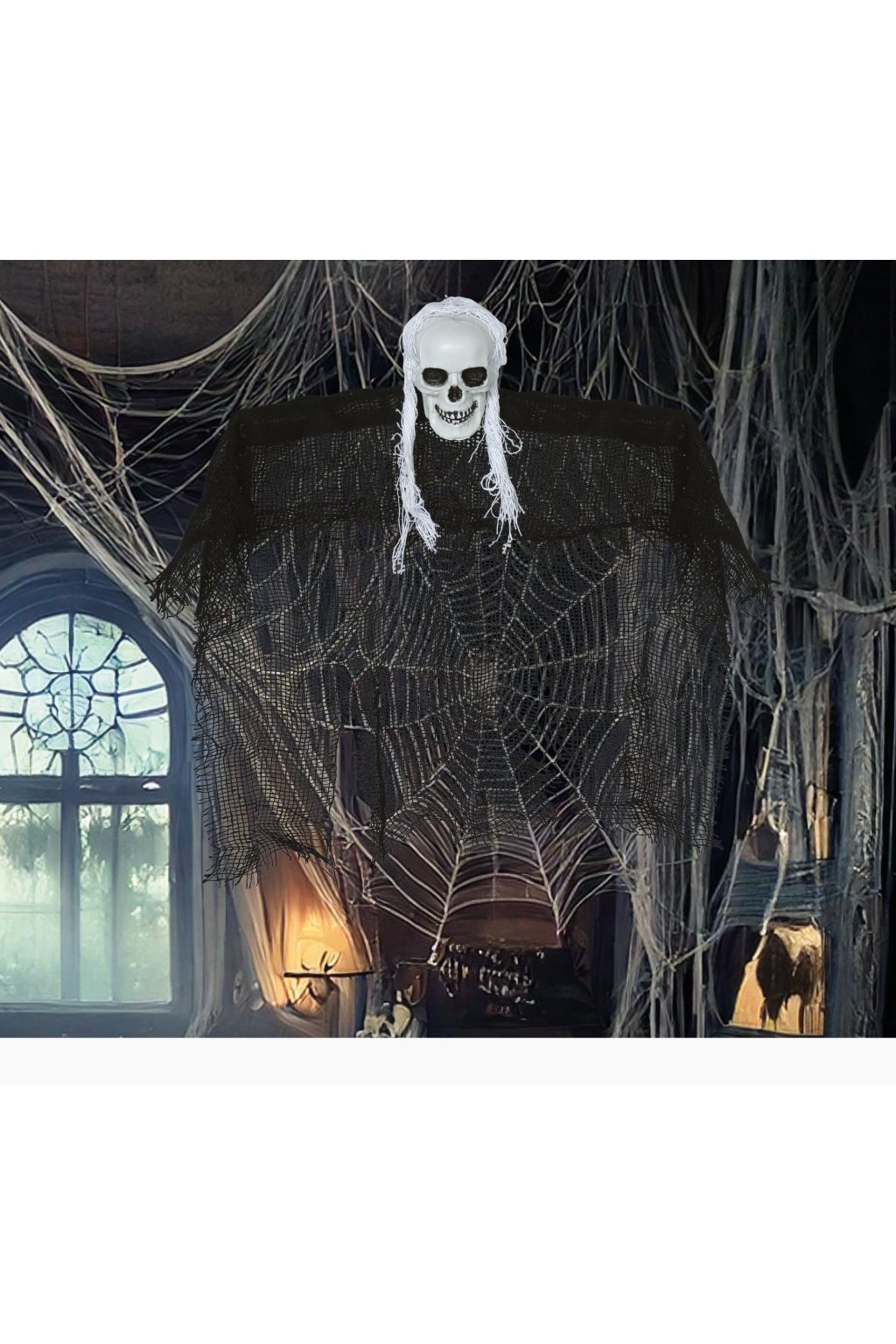 Velikost 24cm - strašidelná dekorace s lebkou, kostlivýma rukama a potrhaným závojem