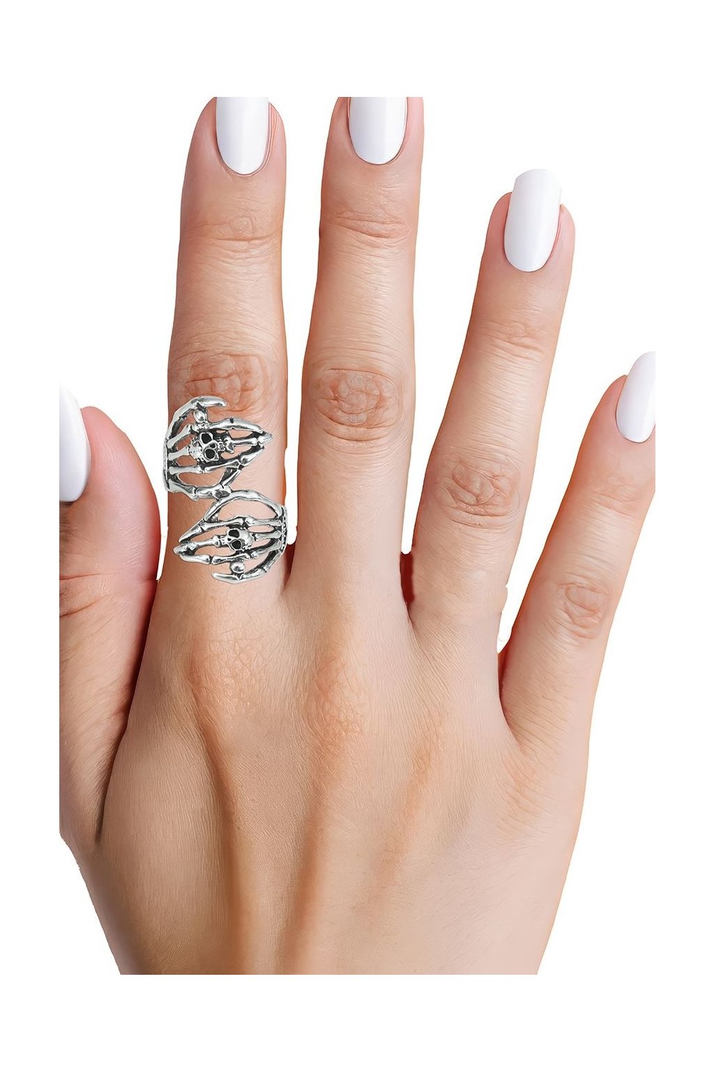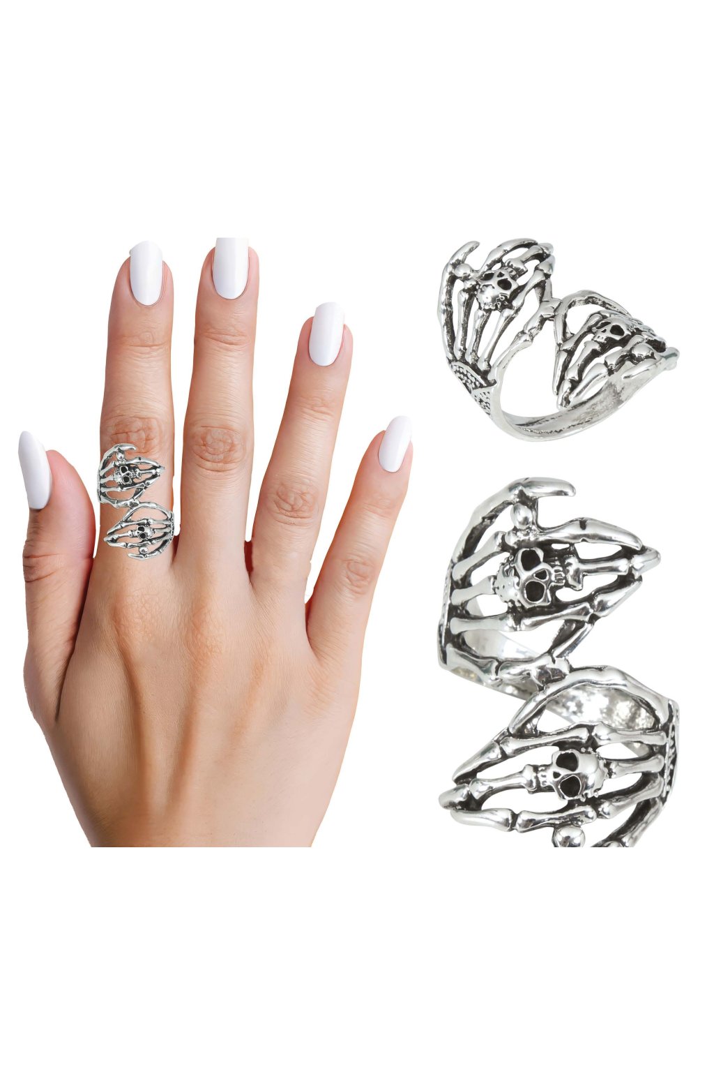Stylový kovový prsten ve tvaru dvou kostlivých rukou držících lebku