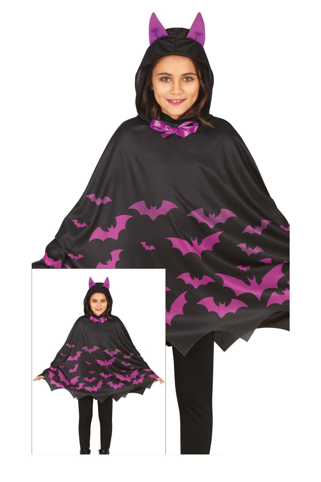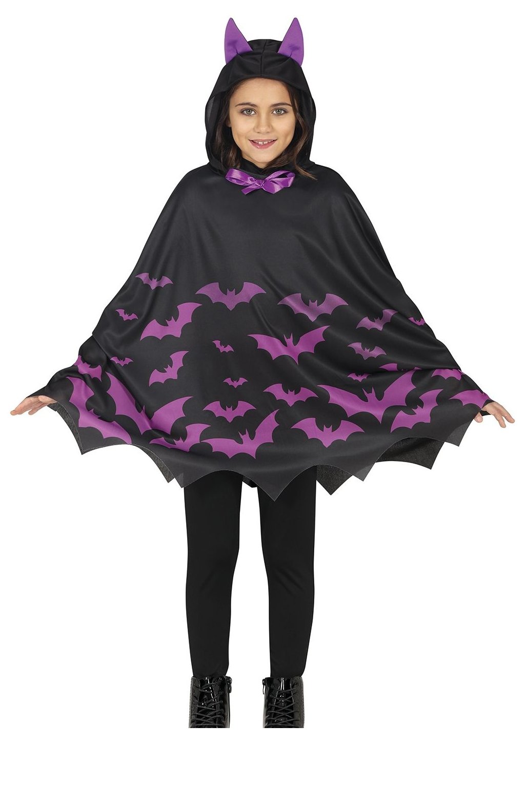 Černé pončo s potiskem fialových netopýrů a špičatým zakončením