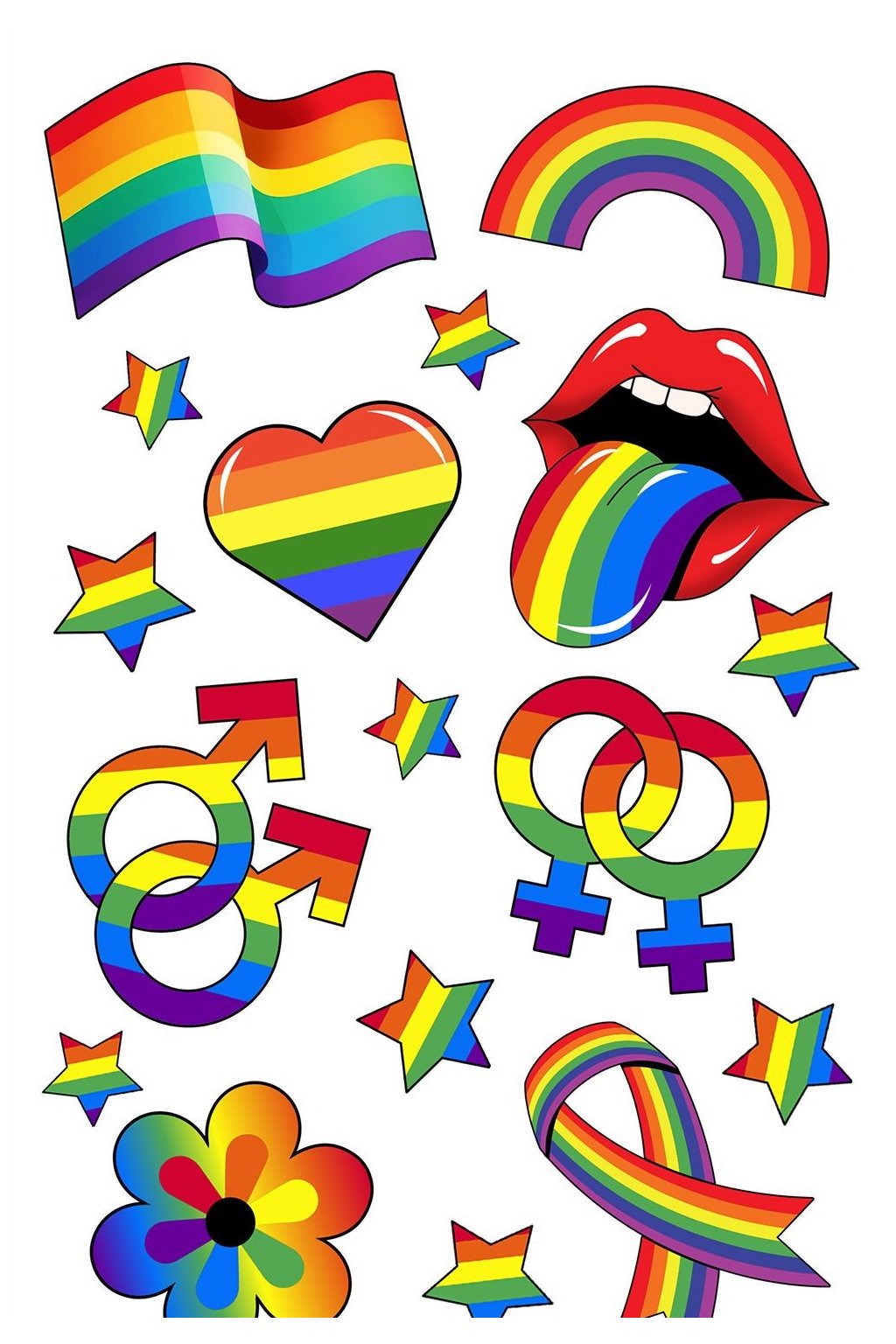 barevné motivy duhy, srdcí, symbolů a vlajek