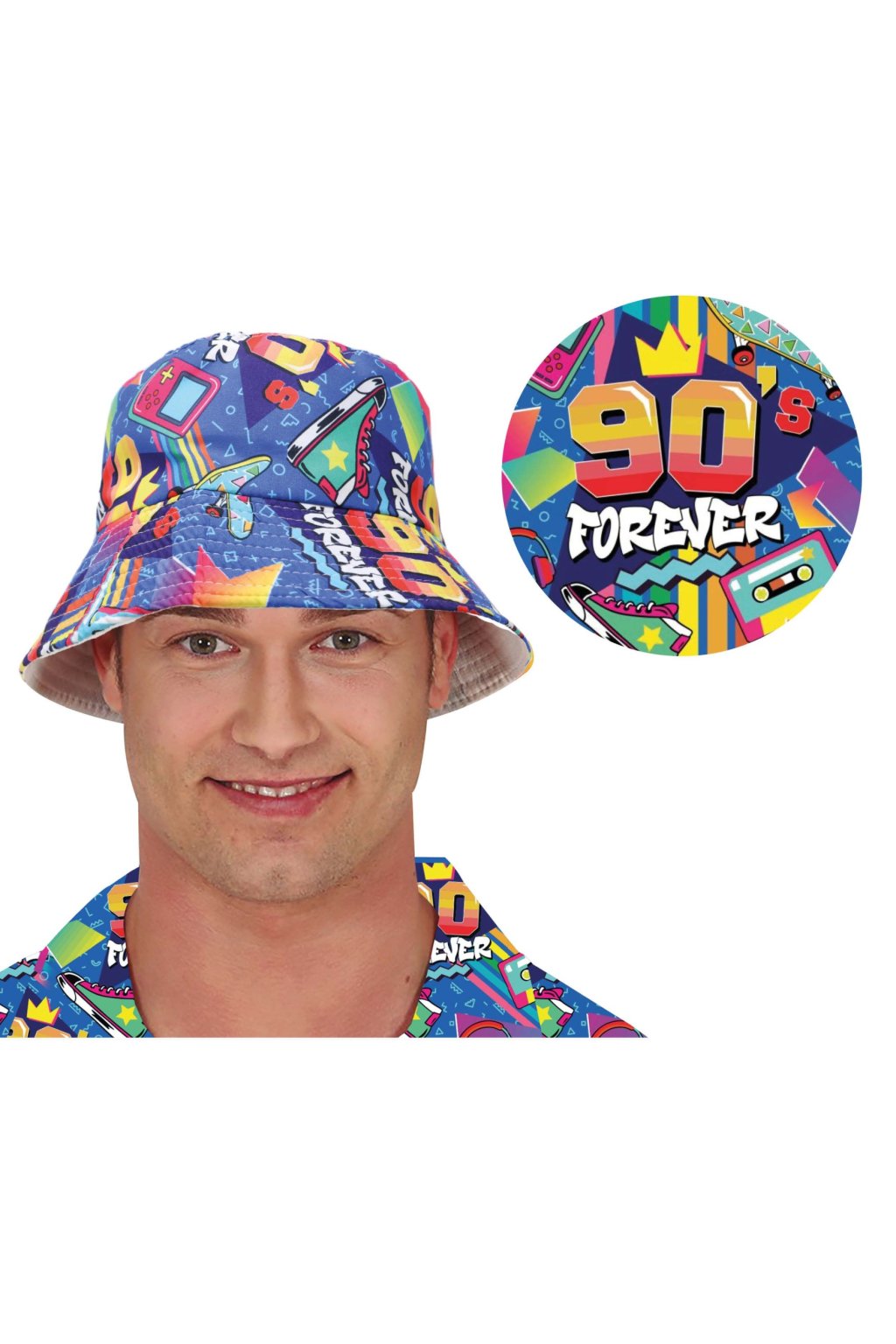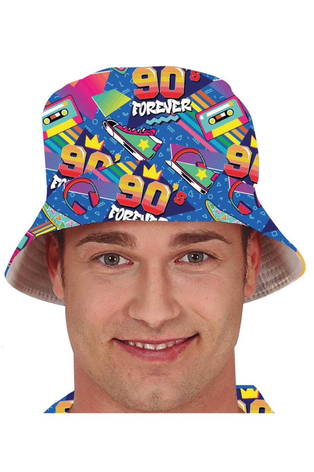Stylový bucket hat s potiskem herních konzolí, kazet a nápisem „90's Forever“