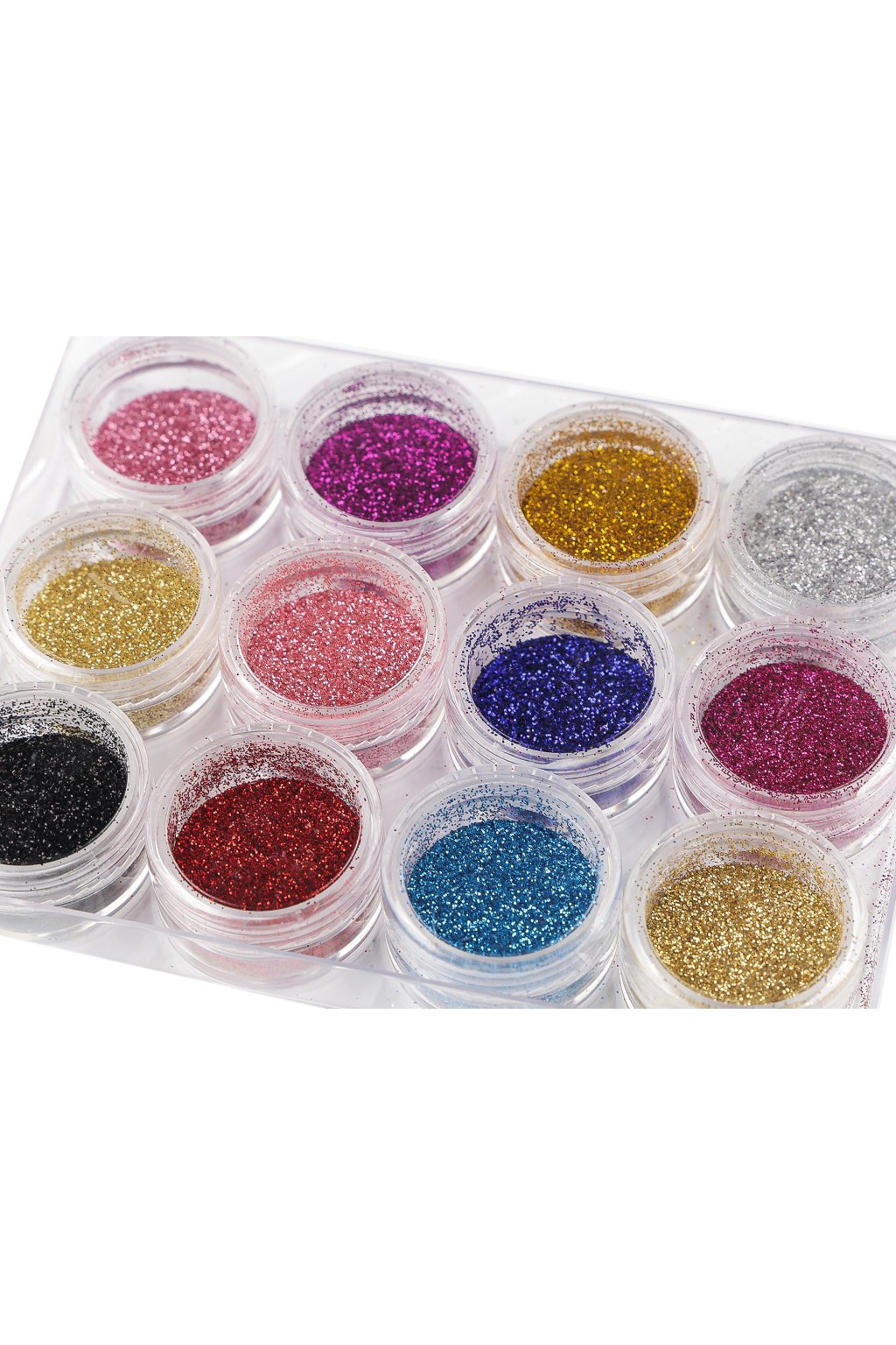 Sada 12 barev sypkých glitrů ve šroubovacích dózách se hodí na ozdobení prakticky čehokoliv.