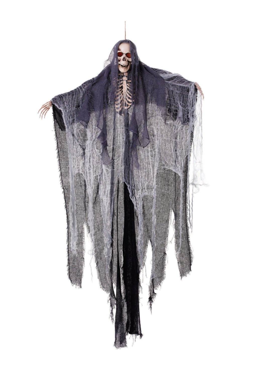 - Strašidelná halloweenská dekorace – kostlivec zahalený v potrhaném černém plášti, který dodá vašemu domovu tajemnou atmosféru.