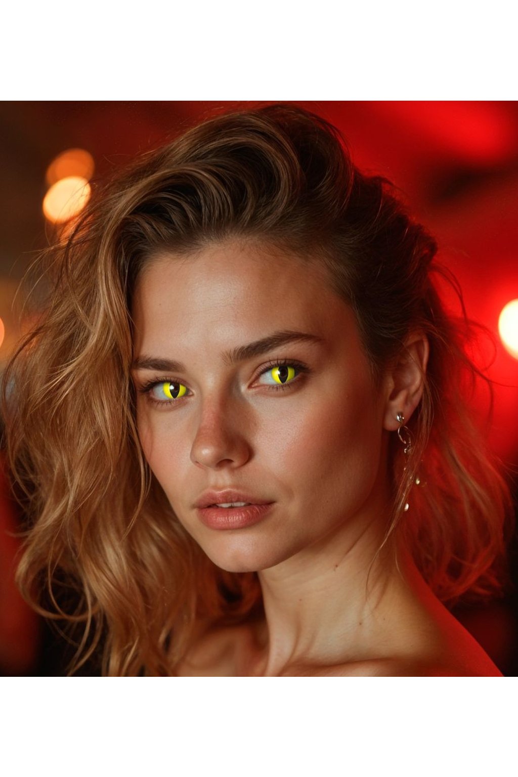 Tyto žluté kontaktní čočky mají zářivě žlutou barvu a zornička je černou barvou protažena do úzké škvírky, díky tomu je docílen efekt "kočičích očí".